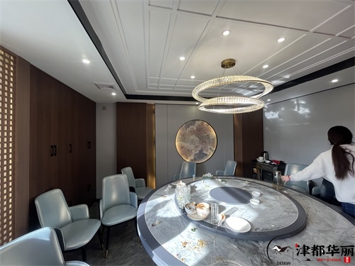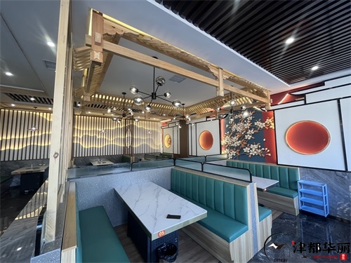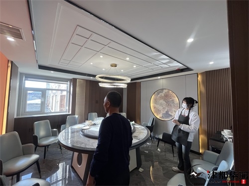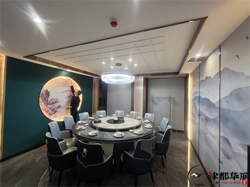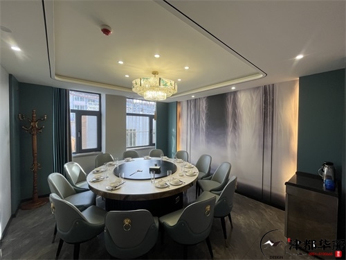 今天分享的是石嘴山金龙回坊火锅店装修设计实景,这家火锅店装修设计风格以新中式国潮风为核心,既保留了传统餐饮空间的雅致底蕴,又通过现代手法注入年轻活力,精准契合了当下火锅店装修设计中“文化赋能+体验升级”的趋势。从包间区域来看,火锅店装修设计的“轻奢质感”被巧妙落地:墙面采用木纹饰面板搭配金色叶片装饰,既借由木质元素传递中式空间的温润,又以金属细节提升宴请场景的精致感;圆形餐桌搭配带有新中式线条的软包座椅,浅白与墨绿的配色既呼应了传统美学的雅致,又通过软包材质保证了用餐的舒适感;顶部的圆形吊顶+水晶吊灯组合,既以“天圆地方”的传统意象强化空间仪式感,又用灯光的暖调氛围消解了商务包间的冷硬。