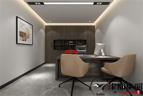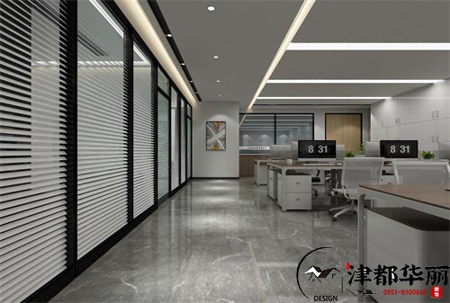首先闯入眼帘的是企业形象墙,以其企业文化的正义、严谨、高效为主题,形象墙造型设计较为简约,加之以灯光衬托,体现出空间的工整气派以及现代时尚特性,以干练快捷的设计节奏,展示出质量与效率并举的时代精神。大维度的开放式办公布局,开阔了整体办公空间,解放了人的思维。简洁的装饰,对称的空间布局,规范方整、功能健全,与环境形成交流,最终达成默契,突出了现代办公环境讲究效率的特征。会议室的设计要追求质感,色彩的搭配上选择了冷色调,采用了透光不透明,有朦胧感的百叶窗帘进行隔断,空间设计上严谨、大气,而且在一定程度保护隐私。在考虑总经理的办公室空间布局时,因对他为人严谨、负责、勤俭的优良品行有所了解,特摒弃了一切繁文缛节的矫饰,一切尽在实用、明快而流畅的格局中;配合现代办公环境的追求,设置实用与展示性相结合的整墙柜体,旁倚商务型老板桌,既陈设精雅、品味清亮、格调一致,又可于繁忙后赏窗外风光、待客会友。在接待室的处理上,用料实际,无须雕琢张扬,直线条的隔断造型给整个空间增添了一丝隐秘,淡色搭配显得空间大方庄重却内含现代时尚。而且色调淡雅的地毯、沙发、背景,还突出了接待厅亲切、和睦、宽松的氛围,使稳静而坦诚的晤谈气氛盎然一室。
