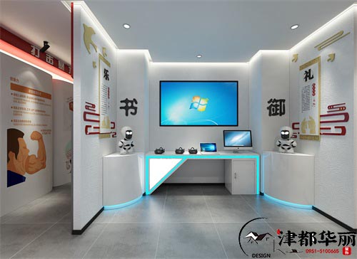 校园文化展厅的装修设计要结合时代话题以及校园文化来进行排版设计,要注意展厅文化板块的顺序以及连贯性,这样可以让学生更好地熟知和记忆。本次设计中,主要围绕一个大的爱国主题“团结统一,和谐共赢”来展开,其次是校园的校园文化、网络文明、打击暴力、礼貌待人,快乐学习。从一个大的集体主题展开,向关于学生个人身心健康方面发展,既灌输了爱国的精神,同时也关注了学生在校园的身心健康,最终归结于让学生在校园可以快乐学习,学以致用。在展厅展览的形式上,用了文字、图片、书籍以及网络科技等方式来展示,文字和图片所表达的更加通俗易懂,书籍可以更详细的解释一些知识,而网络科技表达出的是更为直观,以一种贴近生活的动态方式表现,所以不同的展示方式带给我们的视觉效果不同,结合多种展览方式会让展览形式更加的丰富有趣。颜色的选择上主要用来红色,红色代表爱国、热情以及警醒,能更好的营造展厅的氛围。