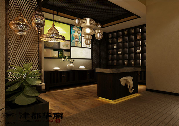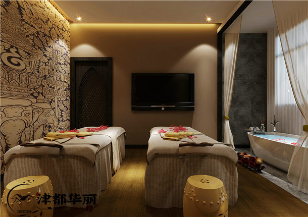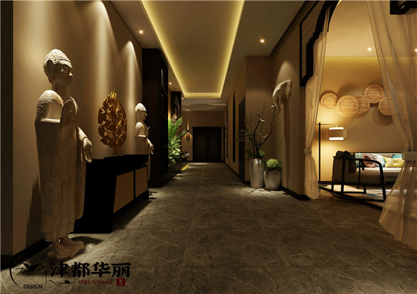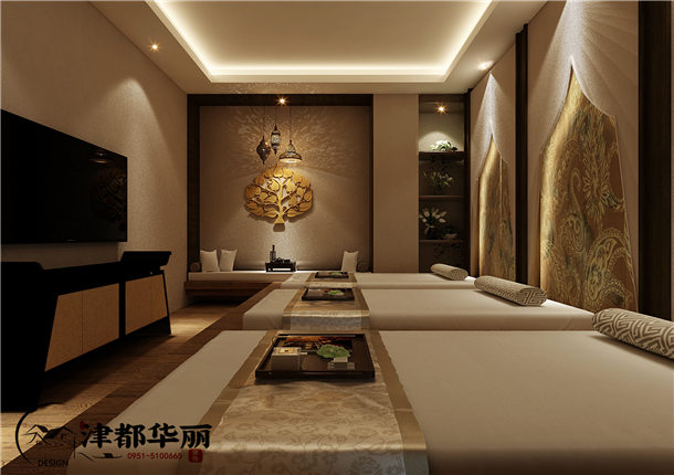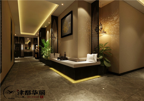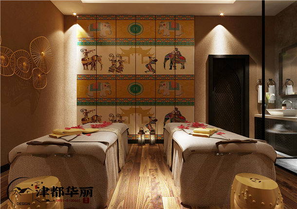 泰式风格的空间充满宗教的神秘感,以及崇尚大自然的清新和舒适,本次泰兰德泰式养生会所的装修就将泰式风格体现的非常有感觉,在装修设计中,设计师加入了宗教元素,让空间更加的神秘,以及让空间氛围更加的宁静祥和。泰式的自然景观也是这次装修的重点设计,大象代表祥和平安,寓意非常的好,不仅是泰式风格的代表,也和养生会所的主题非常的搭配,给人踏实安心的心里安慰。会所空间的绿植搭配非常的清新自然,让我们在这样的封闭空间也能感受到了大自然的清新和美好。空间的色彩以黄色为主,辉煌的色彩,塑造了辉煌的空间。此次的设计,集合了泰式的神秘、自然、辉煌与唯美,让我们感受到了宁静祥和的空间氛围,也让我们感知到了泰国文化的神奇,更多带给我们是异国风情的神秘和惊喜,在环境的熏陶下,养生会变的更加享受和有趣。